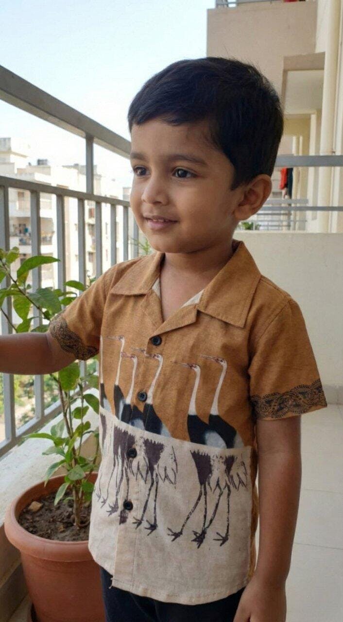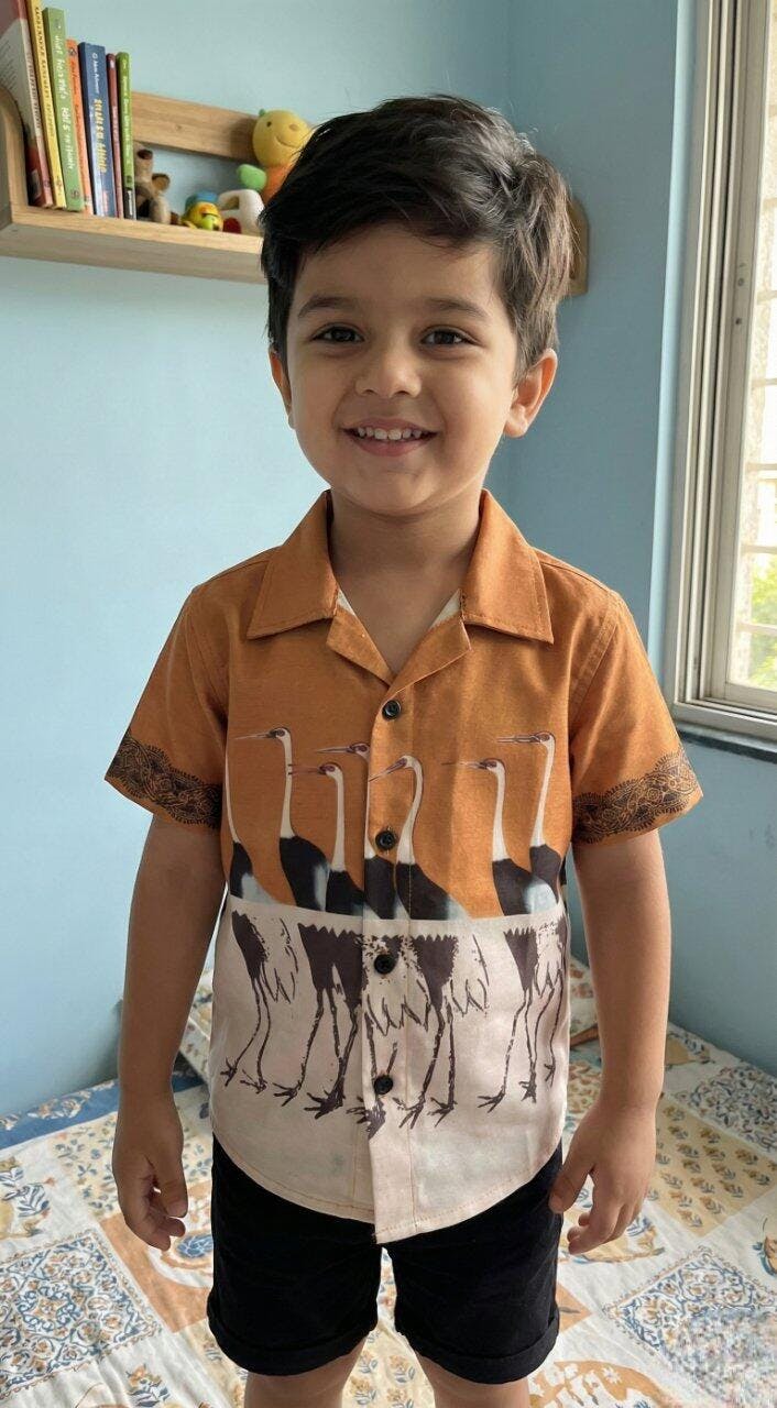 Boys' Artistic 'Golden Crane' Shirt – Two-Tone Nature Print
